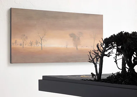 Hun har altid arbejdet figurativt, med mange billedlag og historier i hvert enkelt maleri. Men i denne udstilling har fortællingen fået en ny form og dimension. I billedernes kronologi binder hun alle sine berøringsflader sammen i en moderne, poetisk, men også skræmmende myte.